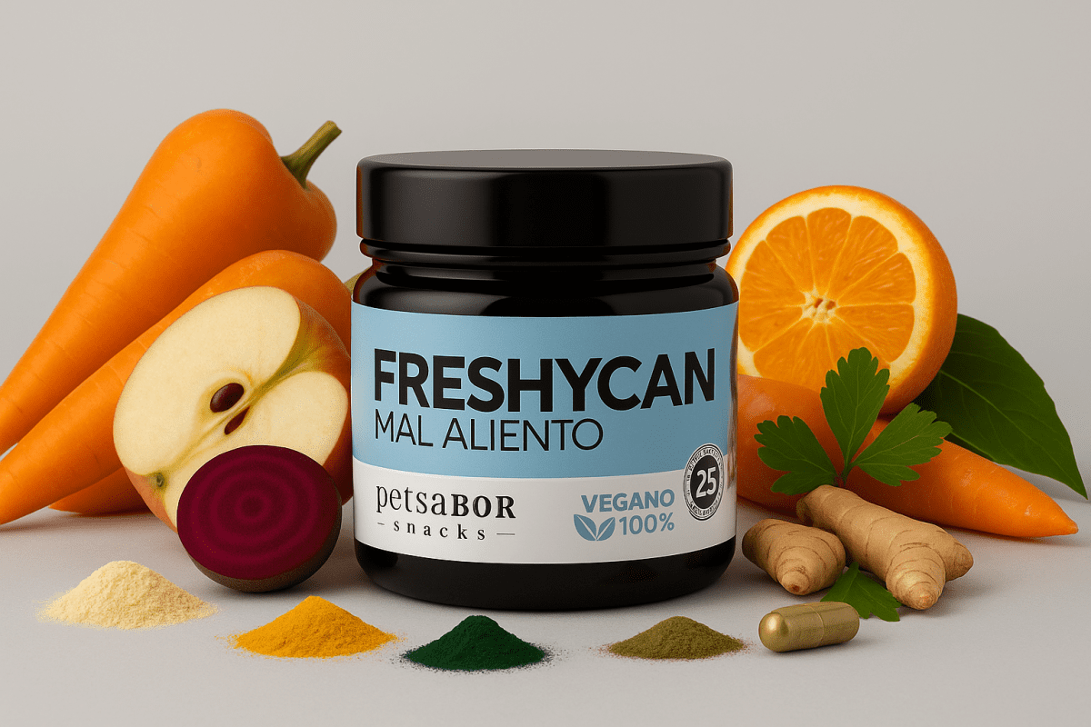 El mal aliento en los perros no solo es molesto, sino que puede ser una señal de problemas bucales o digestivos. Freshycan Vegano es un snack funcional diseñado para refrescar el aliento de forma natural mientras cuida la salud bucal y digestiva de tu perro. Su combinación de ingredientes con efecto purificante, antioxidantes y compuestos refrescantes ayuda a neutralizar el mal olor desde el interior.